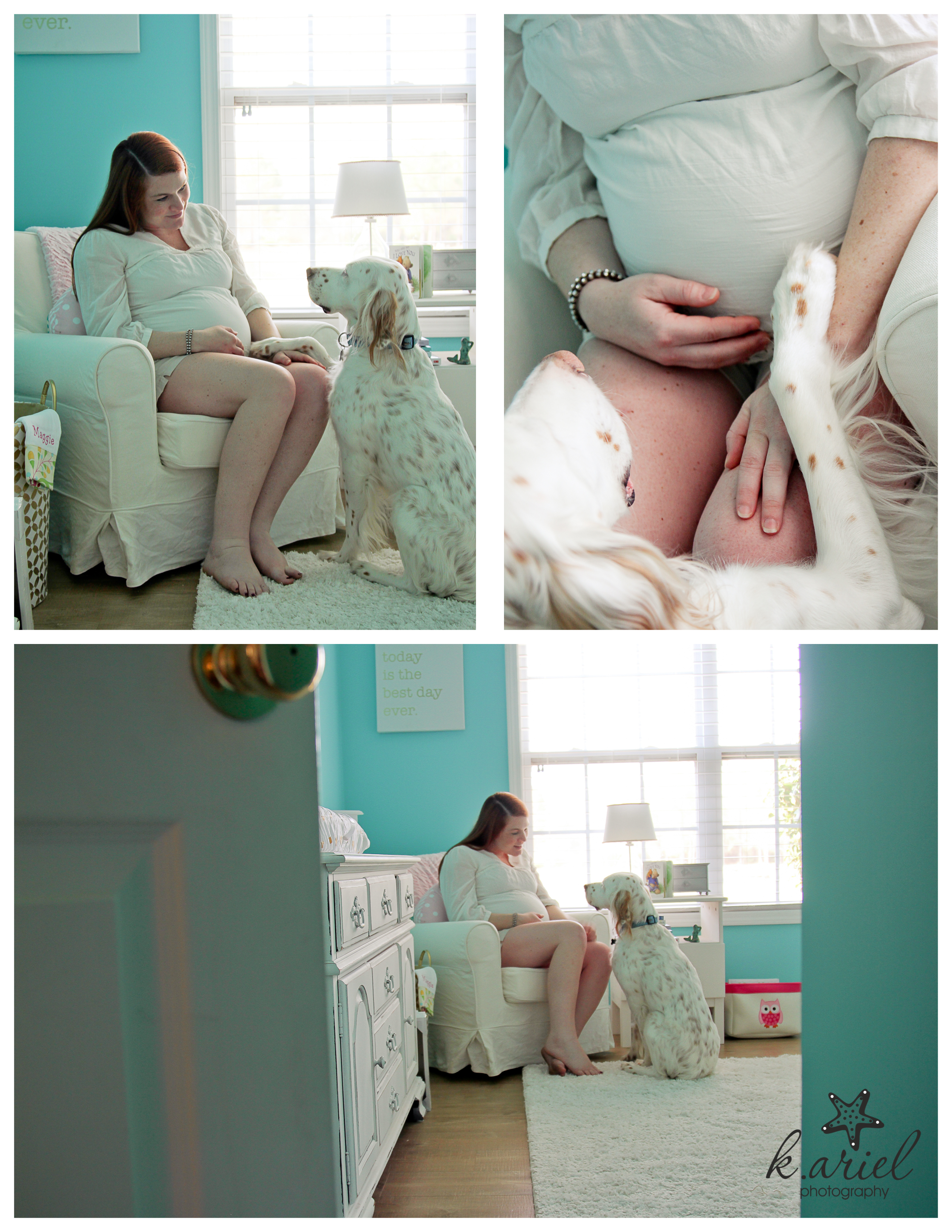 Before having a human baby, Katie Mae was first a mother to two English Setters, Gunner and Molly, so she wanted to incorporate them into her session. Gunner was a lot more attentive and attached to his mommy than Molly was so he’s actually the only one we were able to get pictures with.