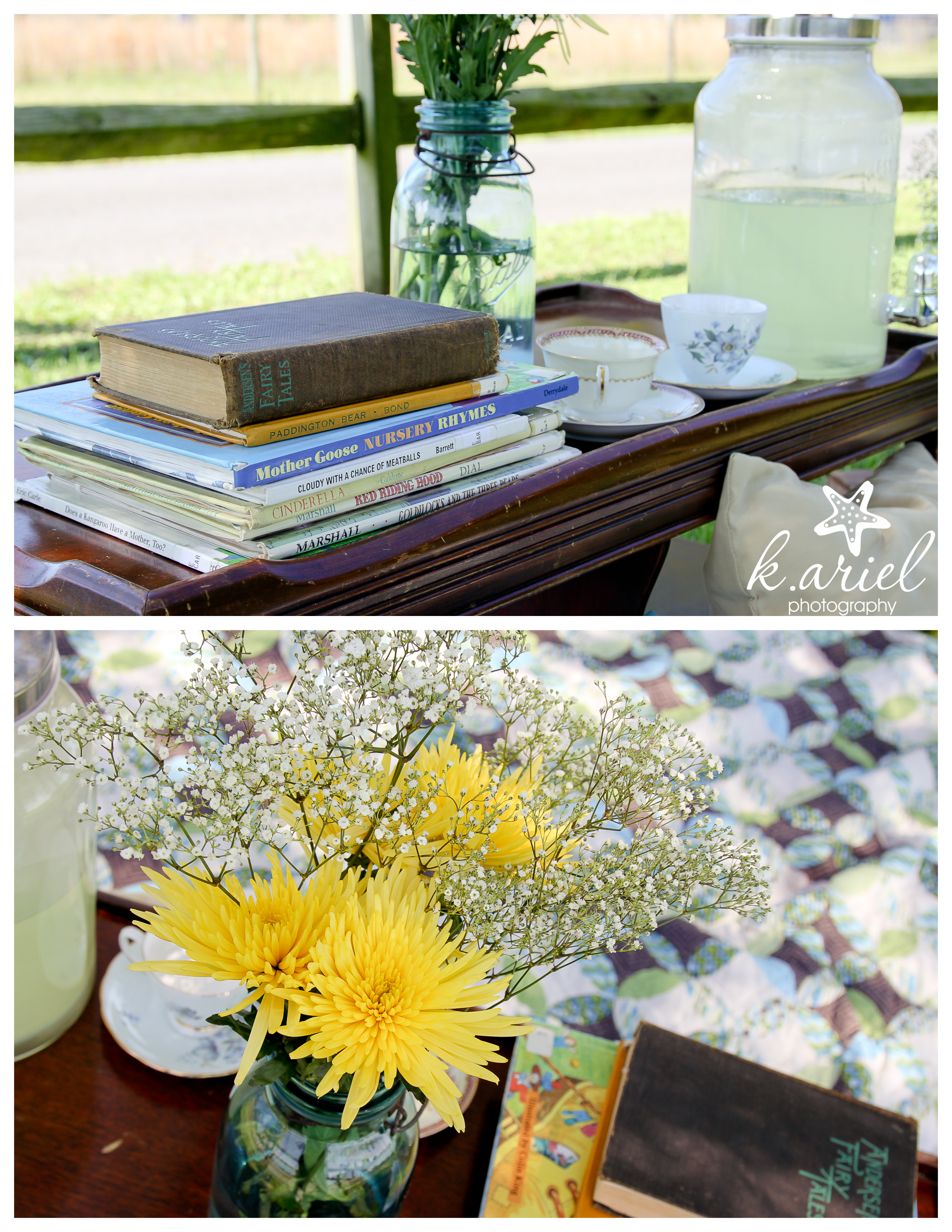 For the set up I went through my house and found blankets, pillows, the coffee table, wooden box and blue mason jars to be vases for the flowers. Then I searched everywhere for some really cute tea cups at local antique shops and borrowed some children’s books from my town’s library. I knew I had at least one little boy coming for a session and I didn’t think tea cups really fit so I also made a tee-pee! I love getting my creative juices going! Taking photographs makes me happy but so does planning and creating! I loved the way everything came out! Take a look!